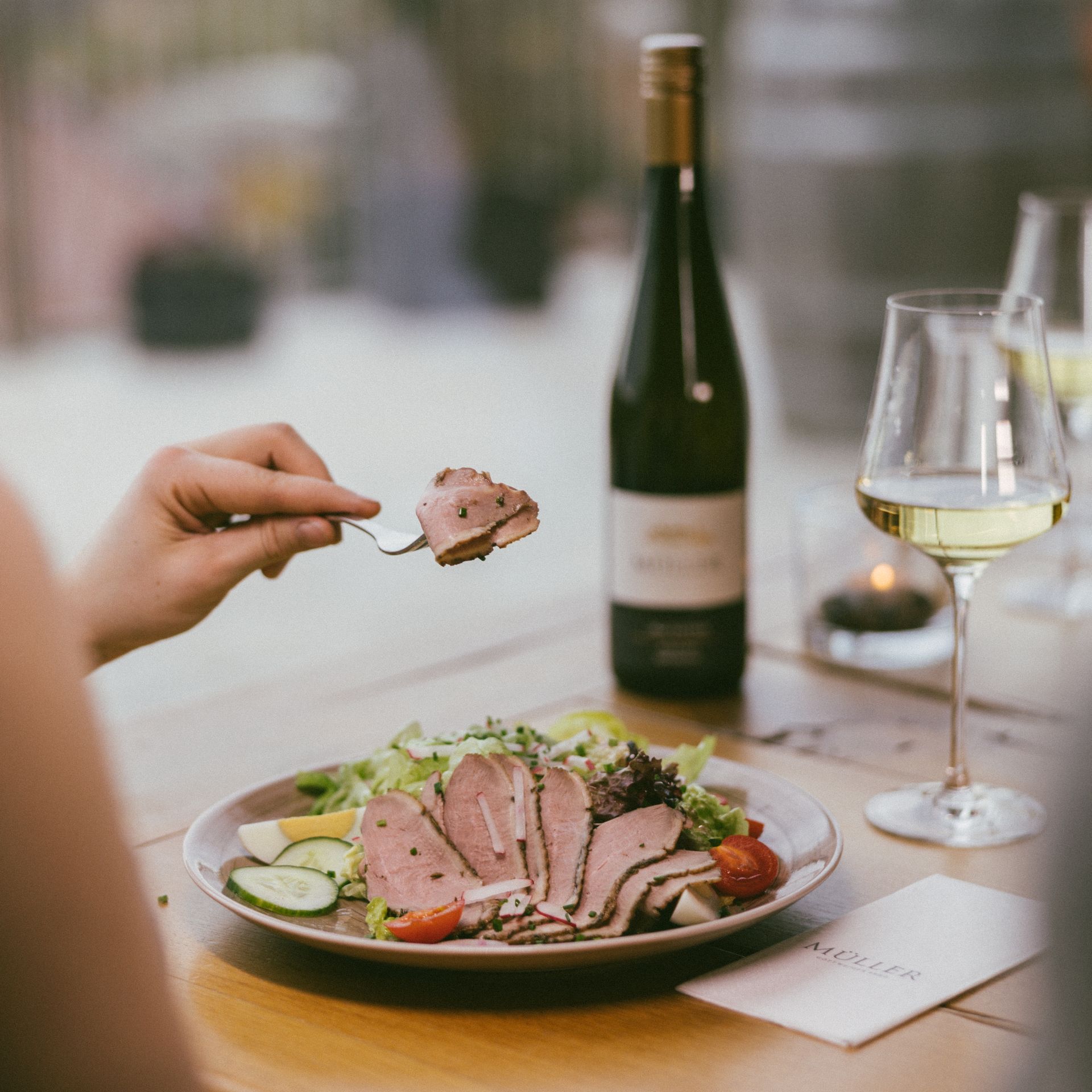 Freuen Sie sich auf eine feine Auswahl klassischer Heurigenspeisen, ergänzt durch besondere Heurigengerichte, die Tradition und modernen Genuss verbinden. Dazu servieren wir Ihnen die gesamte Weinvielfalt des Weinguts Müller, von beliebten Klassikern bis hin zu ausgewählten Top-Weinen mit Jahrgangstiefe.